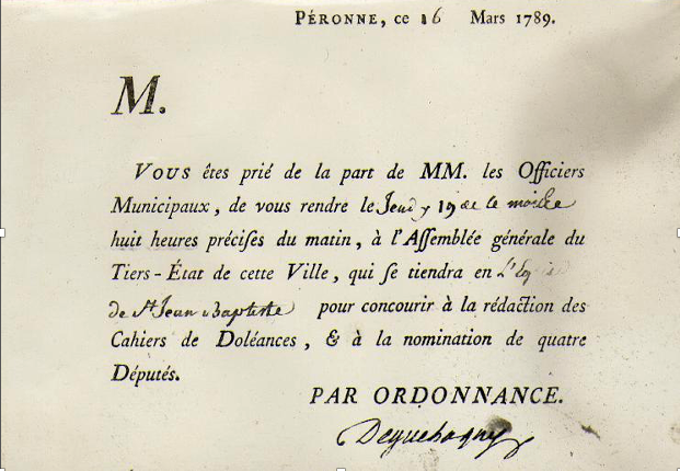 Le 30 janvier plusieurs lettres venues de Paris annonçaient comme une chose certaine que les trois bailliages de Péronne, Montdidier et Roye seraient réunis pour l’élection de leurs députés et qu’il leur en serait accordé quatre : un du Clergé, un de la Noblesse et deux du Tiers-État.