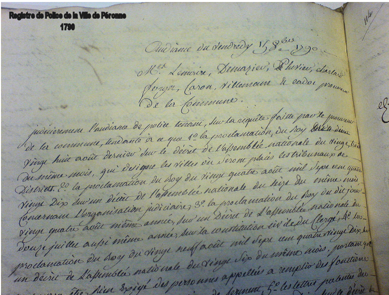 Parmi les sources les plus importantes citons l’inventaire sommaire des Registres du District de 1790 à l’an 4 publié par Mr J Estienne ancien archiviste départemental, le fonds Dehaussy (Mathias-Antoine Dehaussy de Robécourt a été Maire de Péronne, Député à l’Assemblée législative, Président du District de Péronne), le registre de Police de la Ville de Péronne et les archives du district de Montdidier.