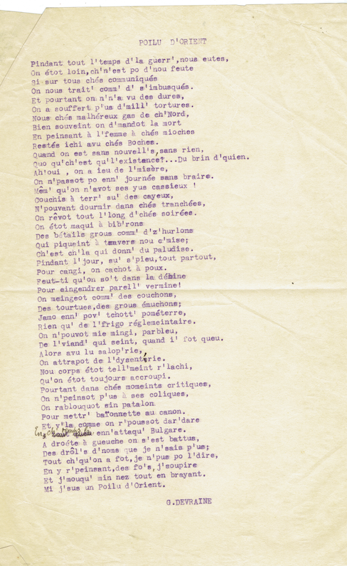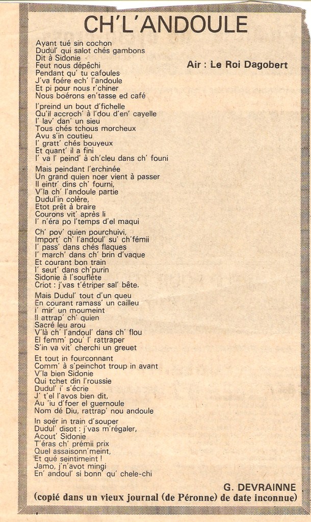 C’est dans le Vermandois que Gustave Devraine a puisé son picard, à commencer par Driencourt, son village natal. Il vécut ensuite à Péronne, le chef-lieu, où il animait la société d’histoire locale et s’occupait de la bibliothèque. Mais c’est bien au long des chemins ruraux que Gustave, le vétérinaire, parle picard au fil de ses rencontres. Son activité quotidienne le conduit en effet de ferme en ferme, où il soigne les vaches chez les éleveurs du pays.