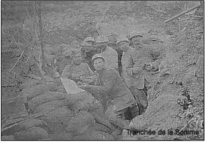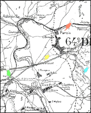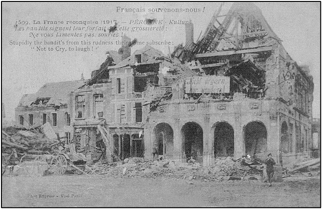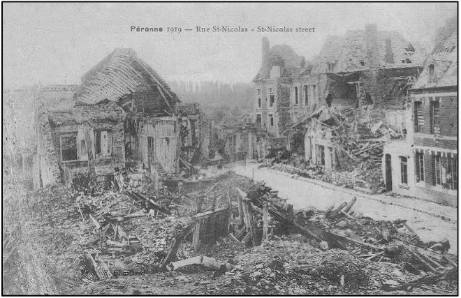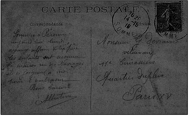 Il est facile de constater que Péronne est sur la ligne de front et Driencourt, dont est originaire Gustave Devraine, à quelques kilomètres au nord-ouest. C’est là au début de la guerre qu’Albertine Devraine enceinte est, avec sa plus jeune fille Jeanne, restée auprès de ses parents Mr et Mme Lemaire.