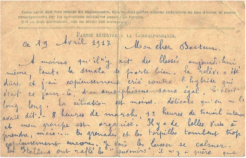 Je vous transmets la carte que j’ai reçue de Suisse, peut-être pourrais-je avoir des nouvelles d’Albertine par ce moyen. Il y a un grand mouvement de troupe en ce moment Je crois qu’il y aura prochainement du nouveau et qu’on pourra rapidement déblayer le Nord. J’ai hâte de partir d’ici où je m’ennuie depuis 6 semaines, d’autant que c’est plein de typhoïde, on en enterre deux ou trois tous les jours. Heureusement qu’il ne fait pas froid, car avec la vie que mènent les malheureux fantassins dans les tranchées, il n’y aurait bientôt plus de soldats.