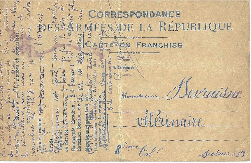 | Juillet 1915 | il est promu au grade de Vétérinaire Aide Major de 2ème classe. |