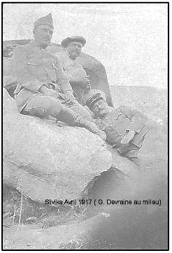 | 17 janvier 1915 | Souvenir d’un anniversaire bien triste. (Il s’est marié à Driencourt avec Albertine Lemaire le 17 janvier 1906) Une photographie prise à Fère en Tardenois en janvier 1915 montre Gustave Devraine à cheval en compagnie de l’adjudant Catherine, du maréchal des logis Bégard, du brigadier fourrier Gohier, du maréchal des logis Loiré, du maréchal des logis Dupont ,du maréchal des logis SaintMartin ,du maréchal des logis Malochard et du maréchal des logis Warin appartenant tous au C.V.A.D.69. |