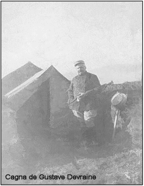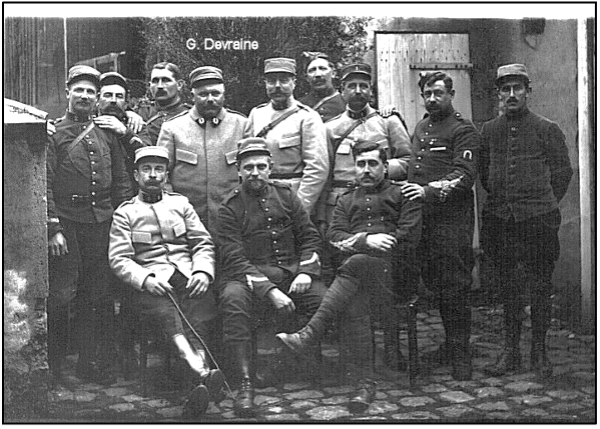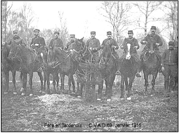 | 17 janvier 1915 | Souvenir d’un anniversaire bien triste. (Il s’est marié à Driencourt avec Albertine Lemaire le 17 janvier 1906) Une photographie prise à Fère en Tardenois en janvier 1915 montre Gustave Devraine à cheval en compagnie de l’adjudant Catherine, du maréchal des logis Bégard, du brigadier fourrier Gohier, du maréchal des logis Loiré, du maréchal des logis Dupont ,du maréchal des logis SaintMartin ,du maréchal des logis Malochard et du maréchal des logis Warin appartenant tous au C.V.A.D.69. |