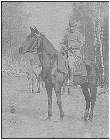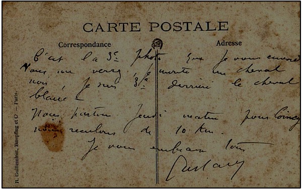 | 6 mai | il adresse à sa famille une carte postale : « C’est la 3è photo que je vous envoie. Vous me verrez, je monte un cheval noir, je suis 3è derrière le cheval blanc. Nous partons jeudi matin pour Coincy, nous reculons de 10 kms. Je vous embrasse tous. Gustave » |
