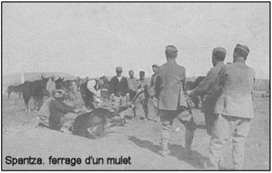 - La gale qui sévit, ne peut être éradiquée compte tenu de la mobilité des animaux suivant les nécessités militaires, de l’utilisation de locaux et de wagons ayant abrité des animaux atteints par la gale, du manque de personnel plus ou moins qualifié pour tondre, traiter, laver les chevaux.