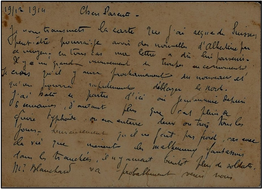 Je vous transmets la carte que j’ai reçue de Suisse, peut-être pourrais-je avoir des nouvelles d’Albertine par ce moyen. Il y a un grand mouvement de troupe en ce moment Je crois qu’il y aura prochainement du nouveau et qu’on pourra rapidement déblayer le Nord. J’ai hâte de partir d’ici où je m’ennuie depuis 6 semaines, d’autant que c’est plein de typhoïde, on en enterre deux ou trois tous les jours. Heureusement qu’il ne fait pas froid, car avec la vie que mènent les malheureux fantassins dans les tranchées, il n’y aurait bientôt plus de soldats.