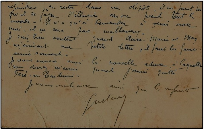 Je vous envoie aussi la nouvelle adresse à laquelle il faudra m’écrire quand j’aurai quitté Fère en Tardenois.